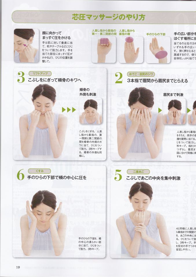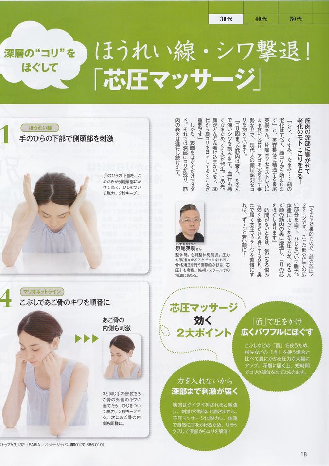 P18 「30代ほうれい線・シワ撃退!芯圧マッサージ」の2ページにわたり心月整体院の芯圧メソッドを用いて行うお顔のセルフマッサージ法が紹介されました。